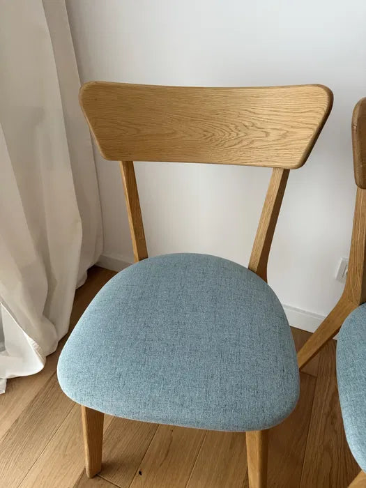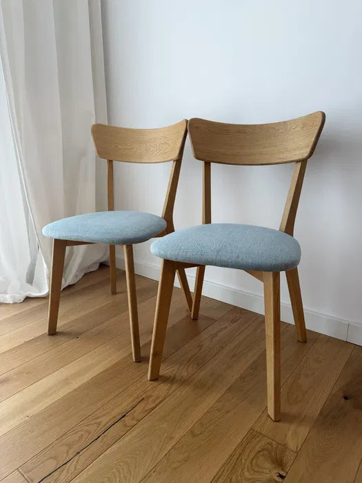 Stolarna är tillverkade i massivt ekträ, stabila, robusta och mycket bekväma. Sitsarna är stoppade i en vacker blågrå färg (ljusblå ton).