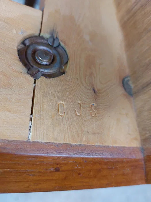 Detta är ett samlarobjekt från den hantverksmässiga  Carl J. Skov Møbelfabrik, vilket bekräftas av den ursprungliga, i träet präglade CJS-signaturen.