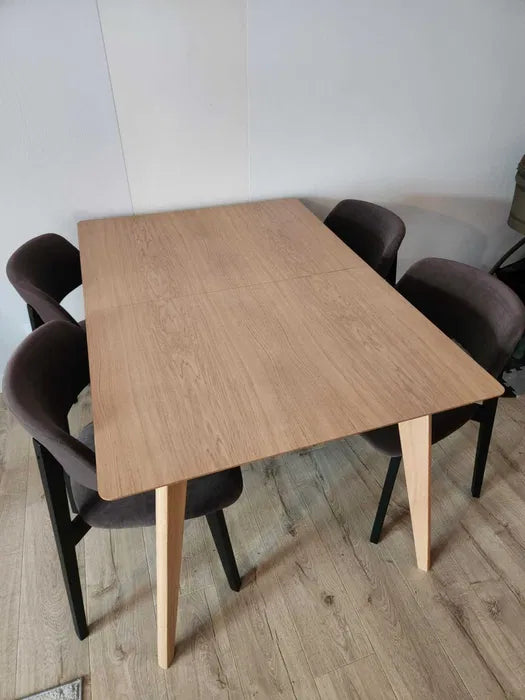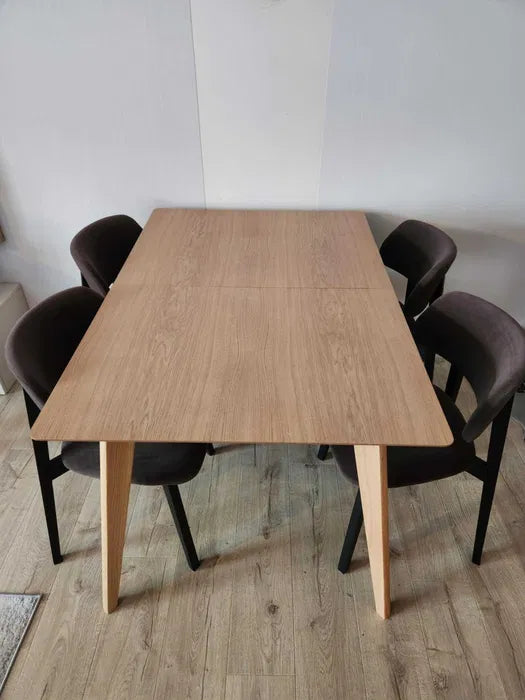 Bordet är i perfekt skick, knappt några repor. 6 stolar TEO II från samma tillverkare ingår, svarta ben, tyg SPARK 29, i utmärkt skick.