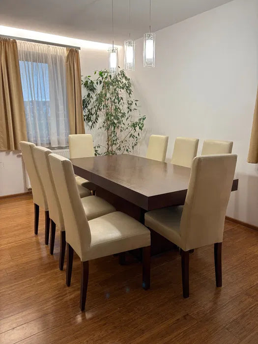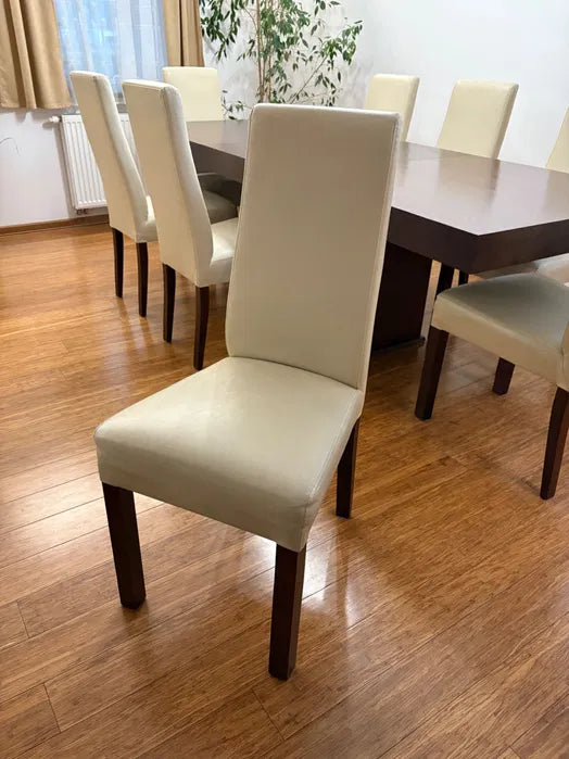 Massivt mörkbrunt bord med ekfanér, inklusive ett set med 8 stolar. Stolarna är klädda i beige eko-läder, i mycket gott skick, med träben.