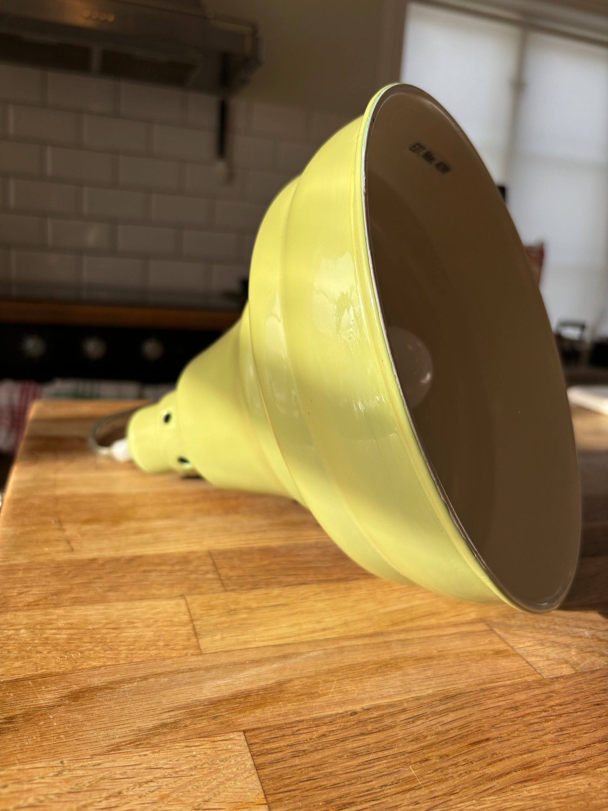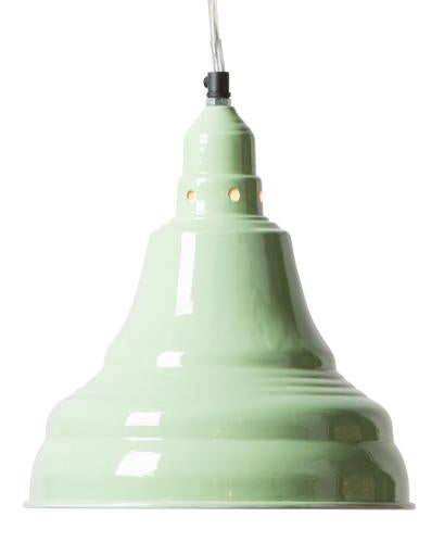 Blyger från Watt & Veke. Blyger är en bedårande pistage/mintgrön taklampa i metall med emaljkänsla. Denna fina taklampa passar som kökslampa, vardagsrumslampa, lampa över ett skrivbord eller hängande på rad över en diskbänk eller arbetsbänk.